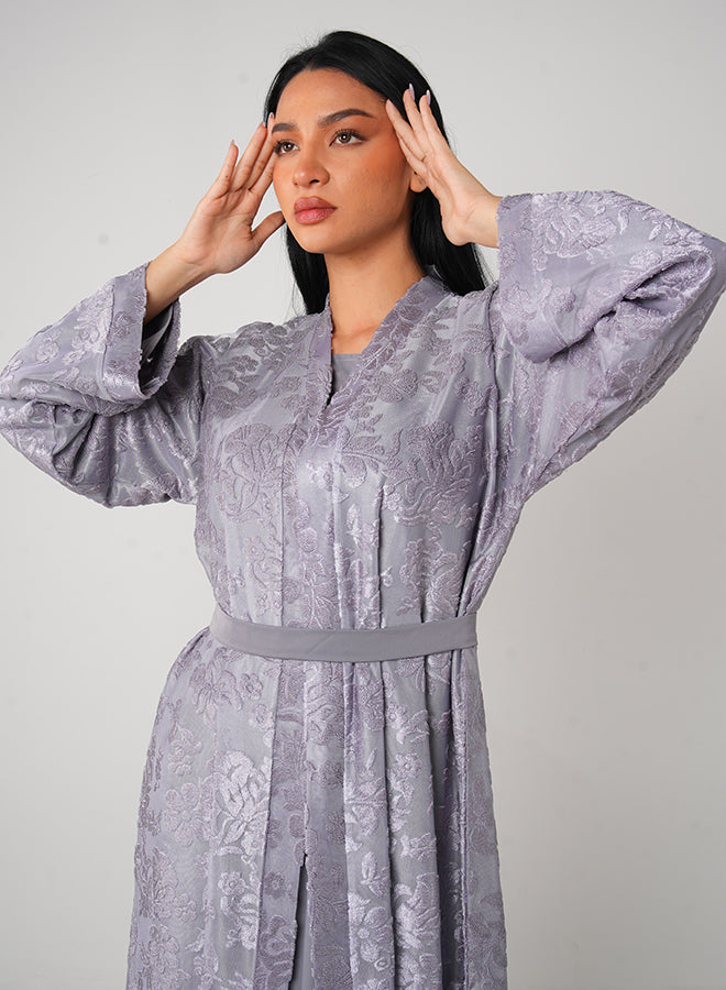 Grey Lace Full Open Abaya (3pcs Set Inner, Belt & Hijab)