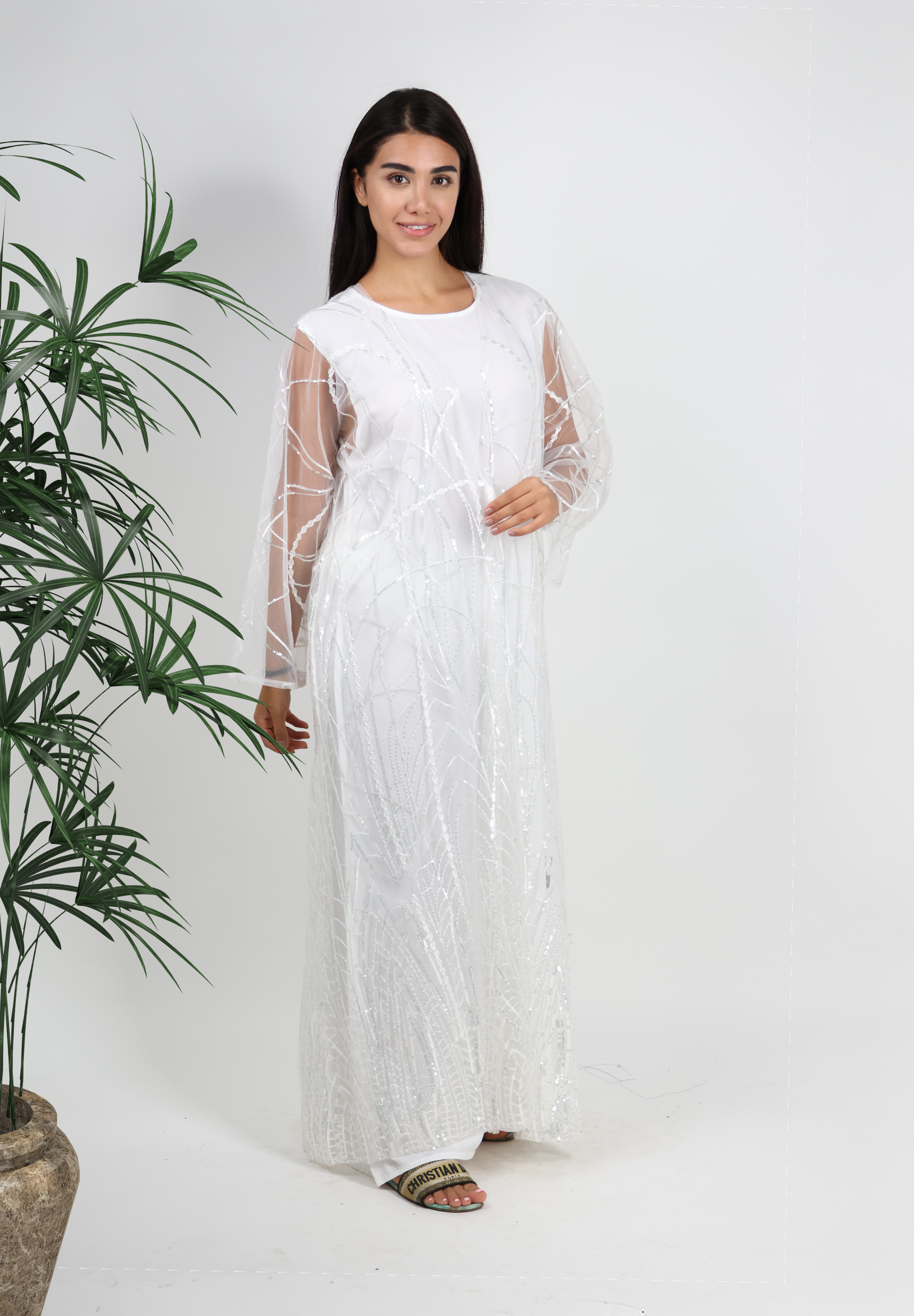 Radiant Sparkle White Abaya with Sheer Embellished Overlay