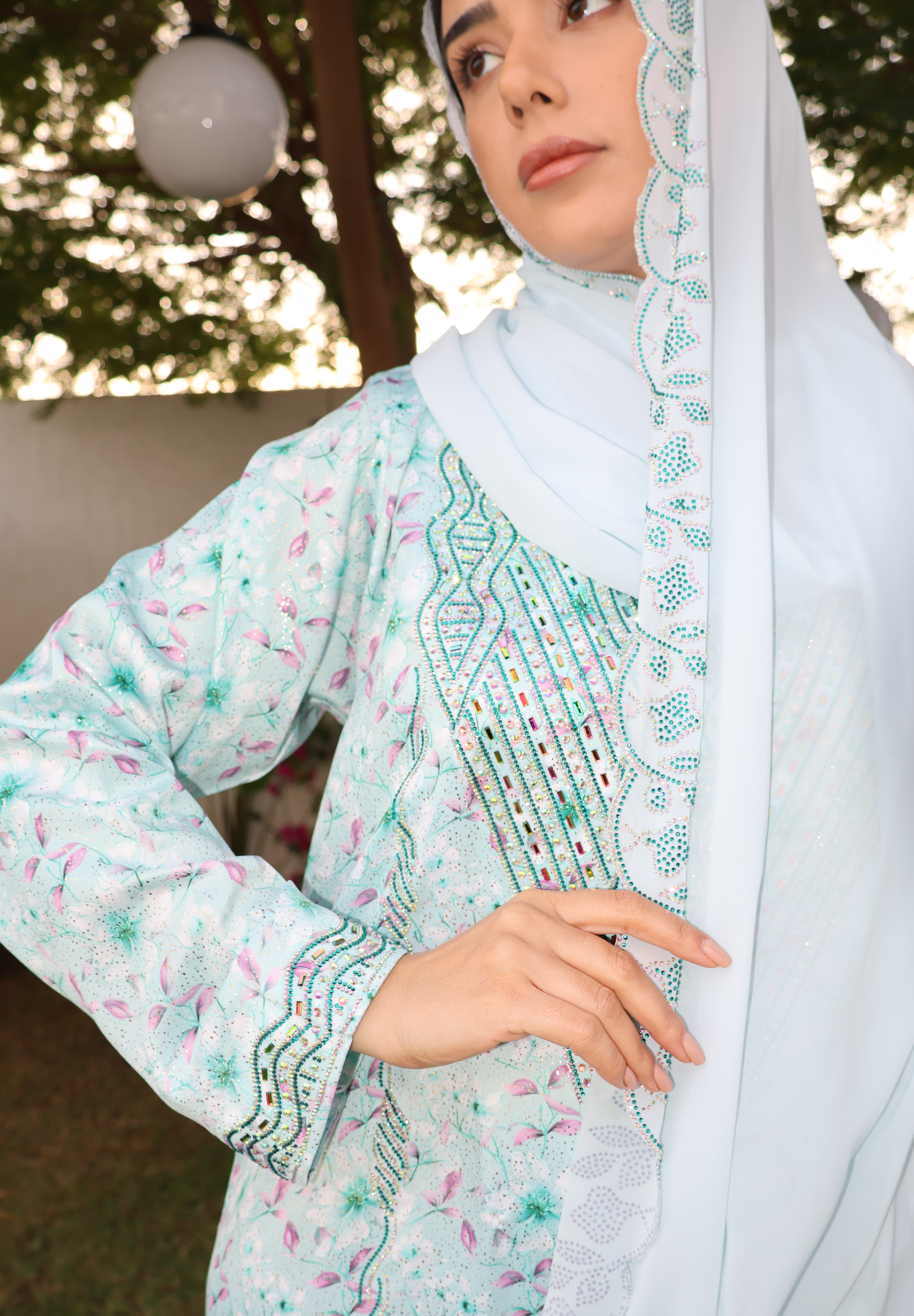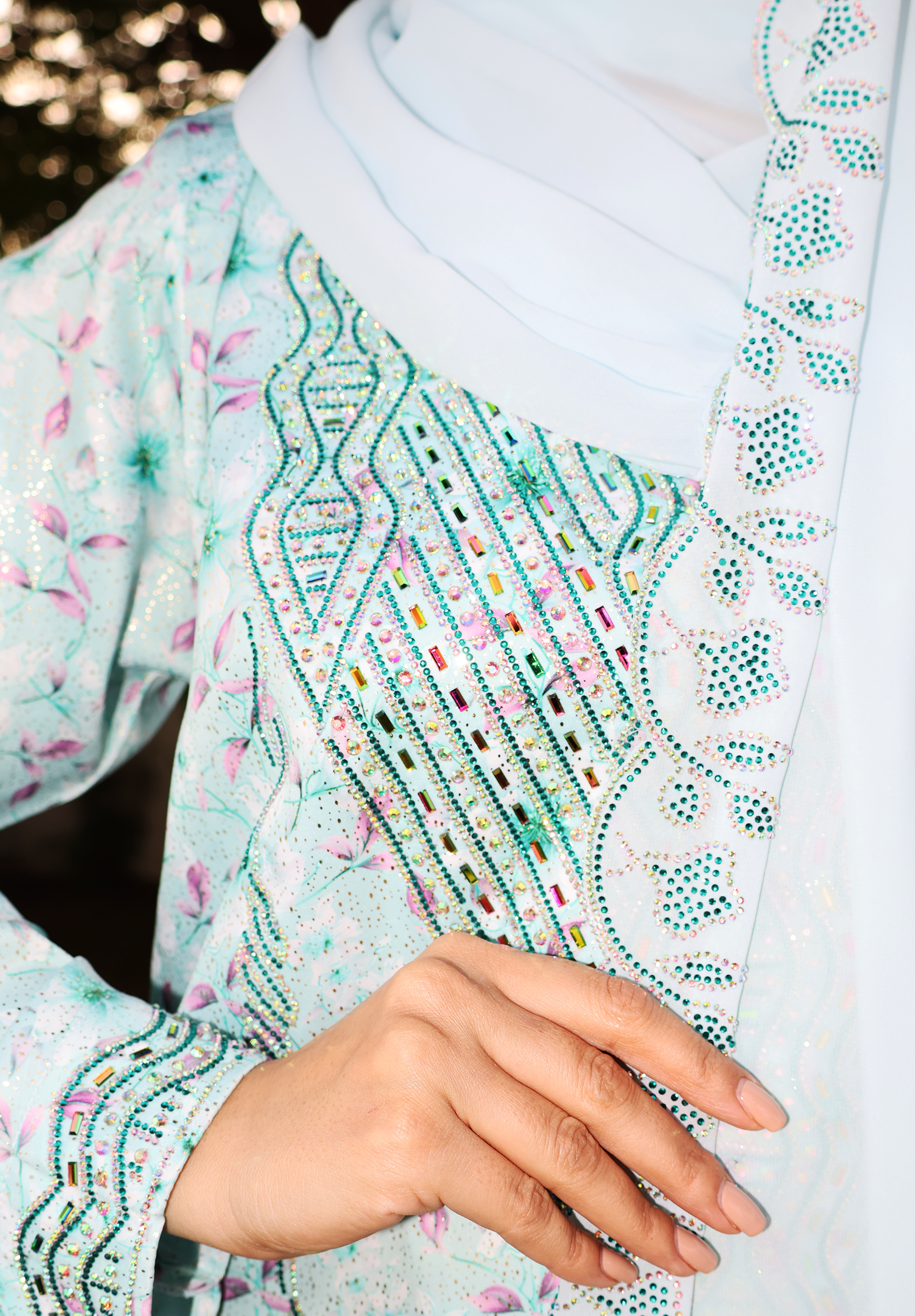 Cobalt Abaya Set – Floral Brocade with Ornate Embroidery Description