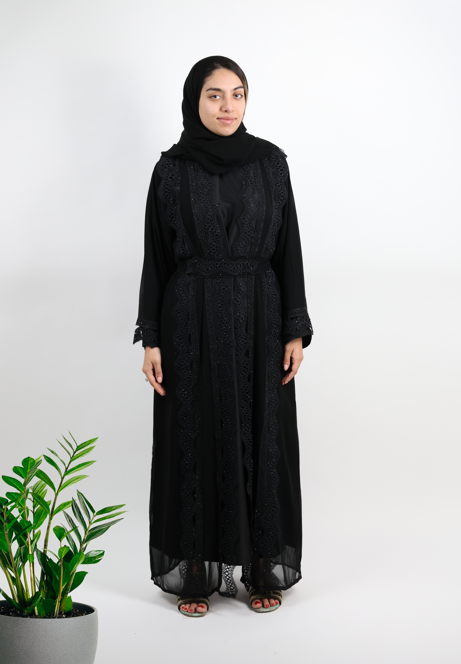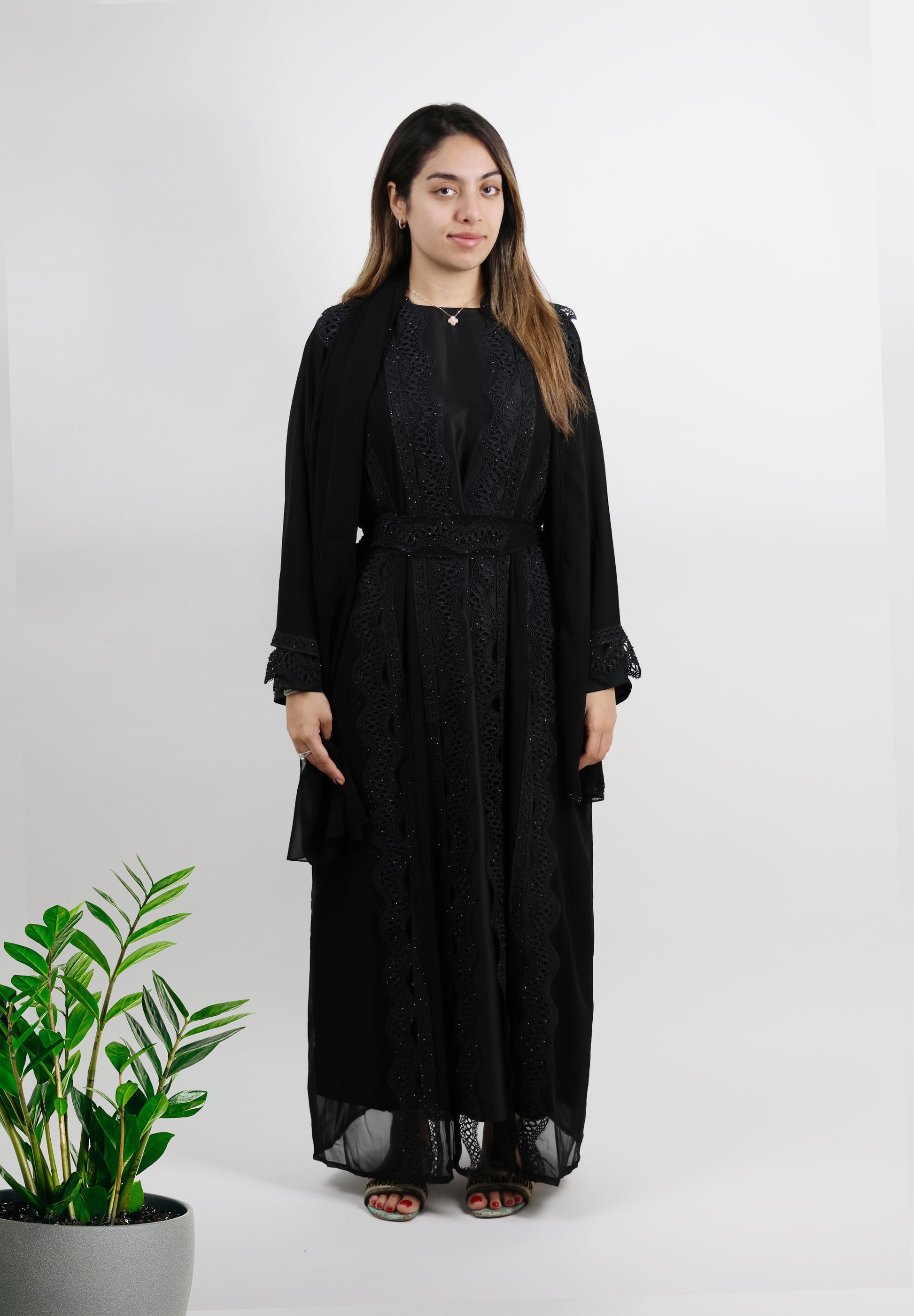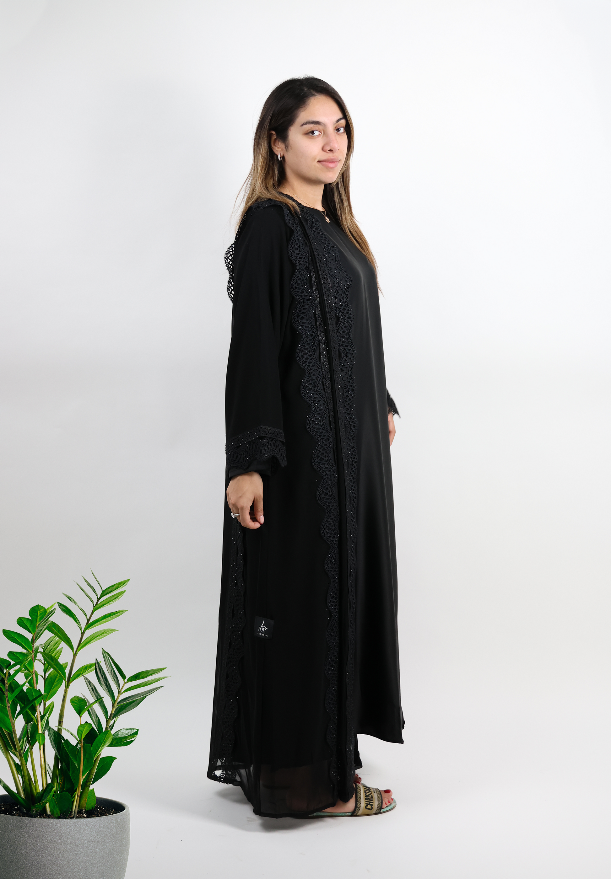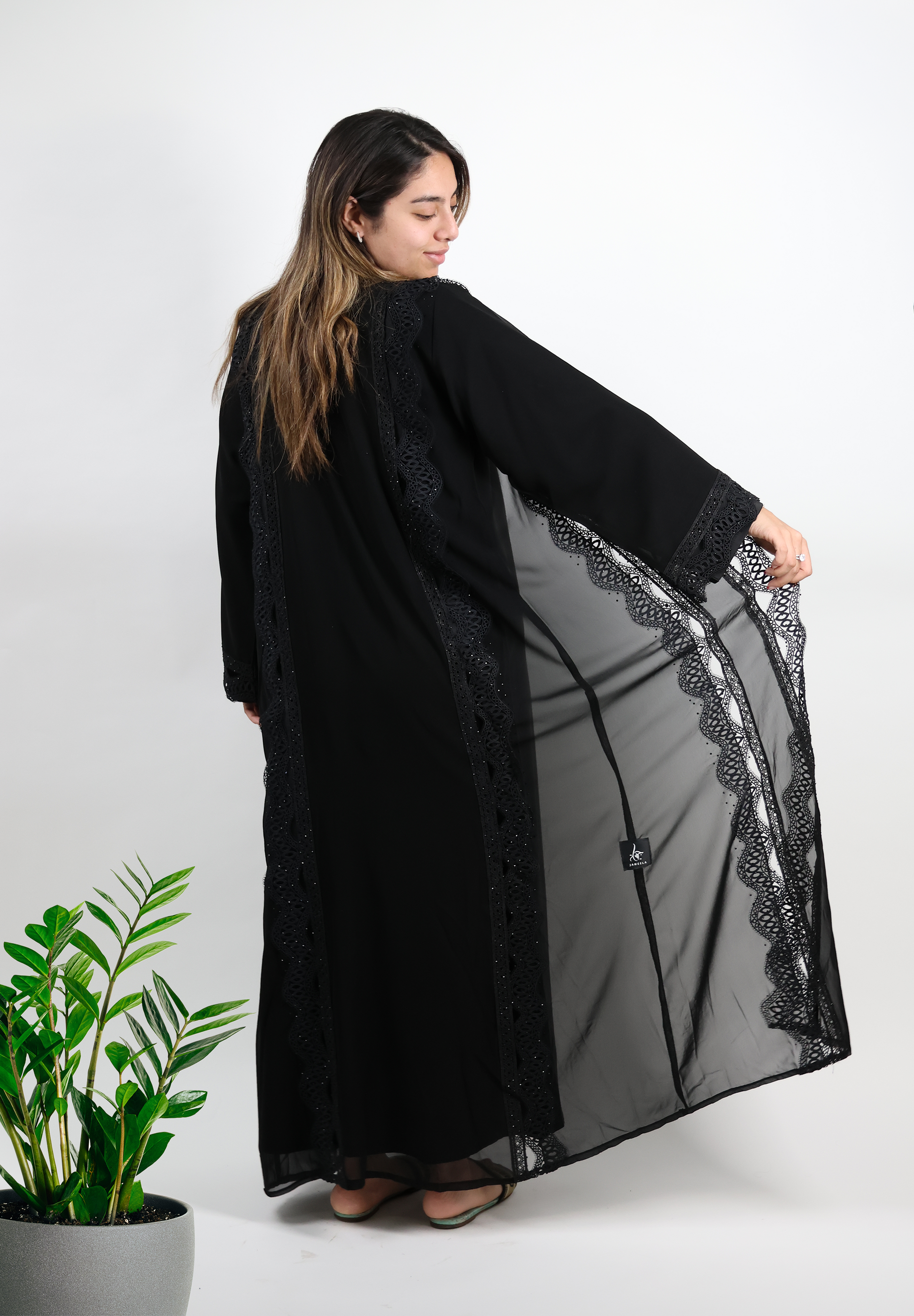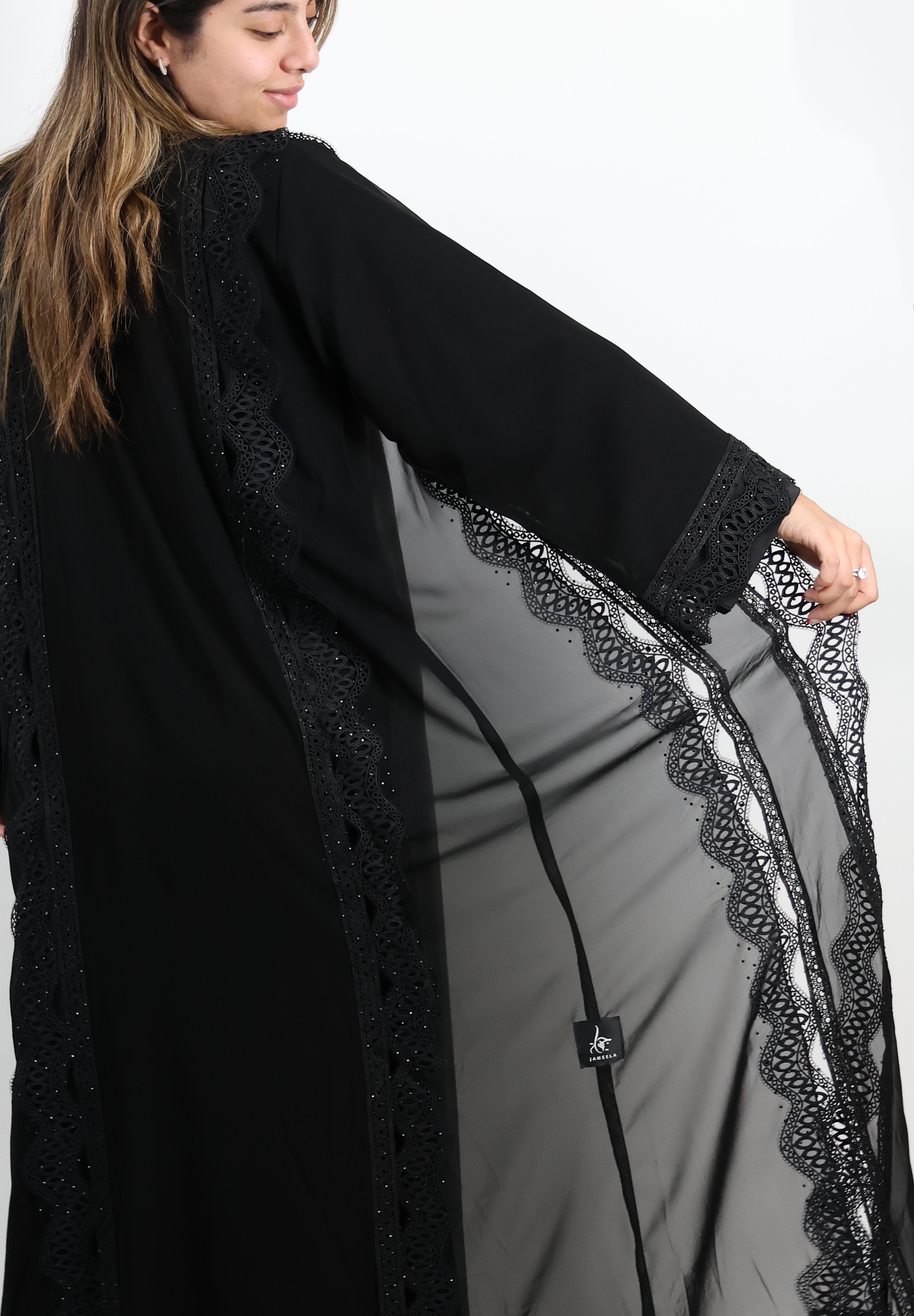 Midnight Lace & Sheer Overlay Abaya - Sophisticated Noir Elegance